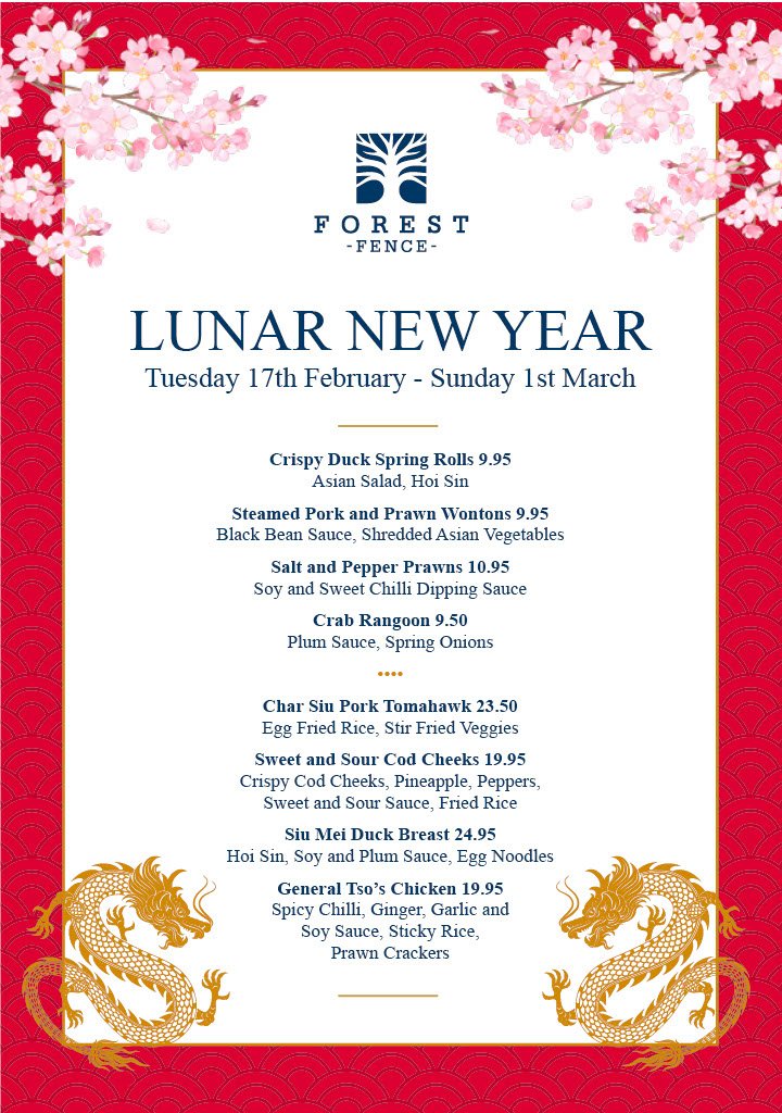 Back to All Events Lunar New Year Tuesday 17 February 2026 12:00 Sunday 1 March 2026 19:00 The Forest Cuckstool Lane Fence, England, BB12 United Kingdom (map) Google Calendar ICS